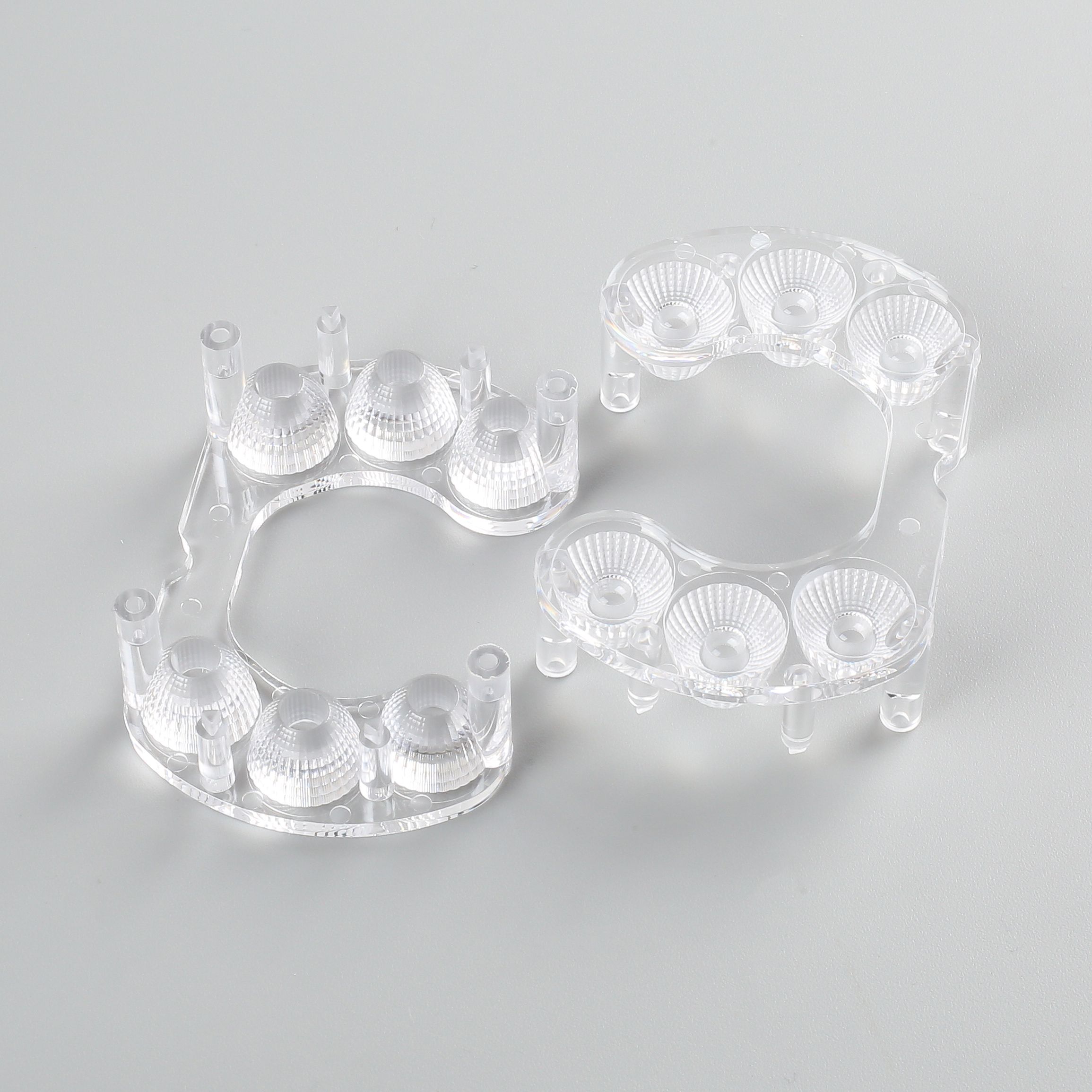 1.产品描述:出光区为磷面,光斑均匀, 非出光区为砂面,底部有4根柱子用于固定在灯板上;长的四根柱子直接可以替代铜柱。